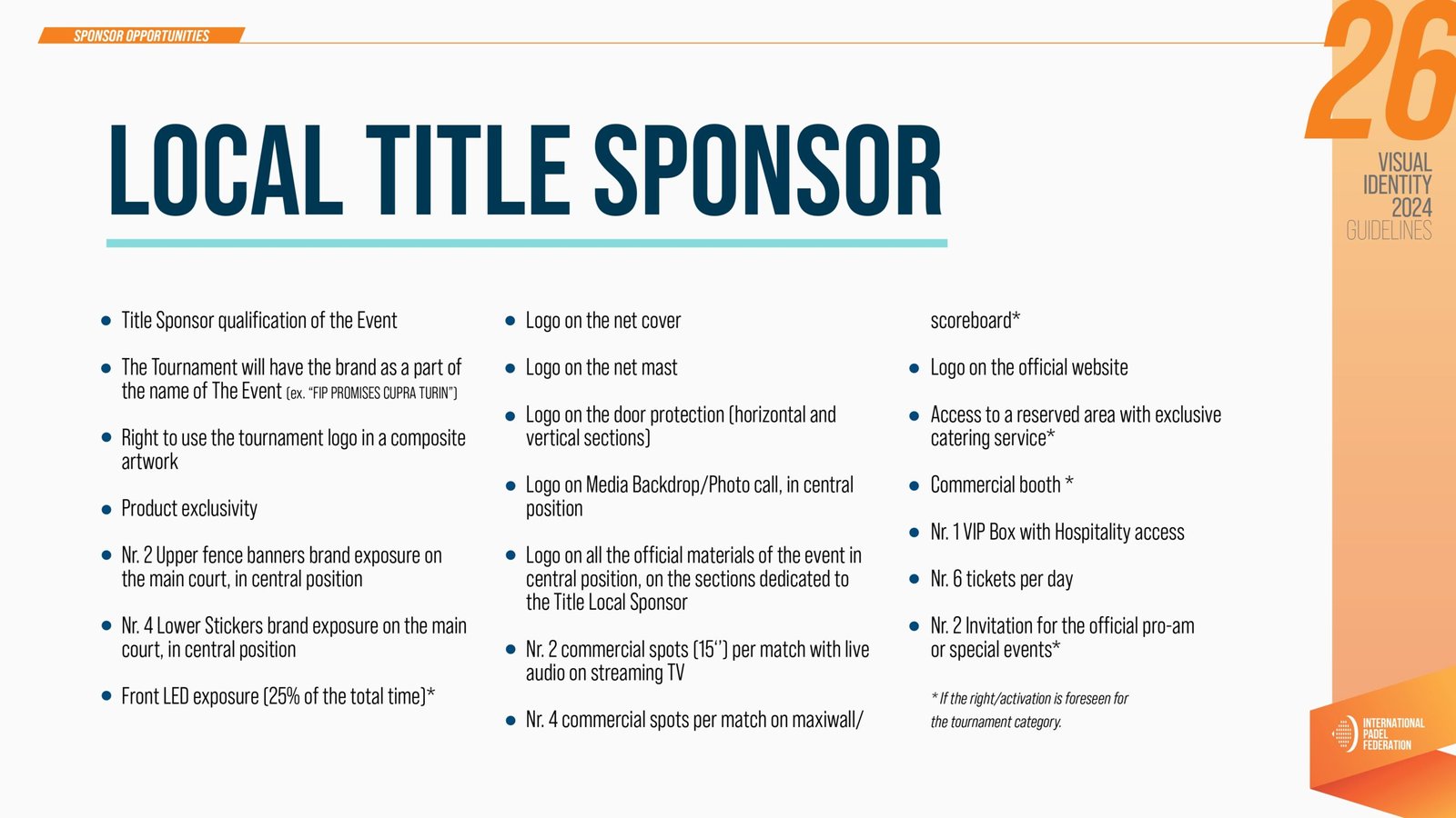 The PROMISES FIP TOUR 2024 Brand Book is designed to elevate the tour’s image on a global scale by implementing a cohesive international visual identity. This comprehensive guide ensures that FIP, along with its global and local partners and organizers, works towards a unified project that offers substantial economic opportunities. The field advertising plan meticulously outlines branding principles, logo applications, color schemes, on-field branding elements, and sponsorship opportunities to maximize the tour’s visibility and impact. The brand book also includes photography guidelines to maintain a consistent and professional image throughout the tour.